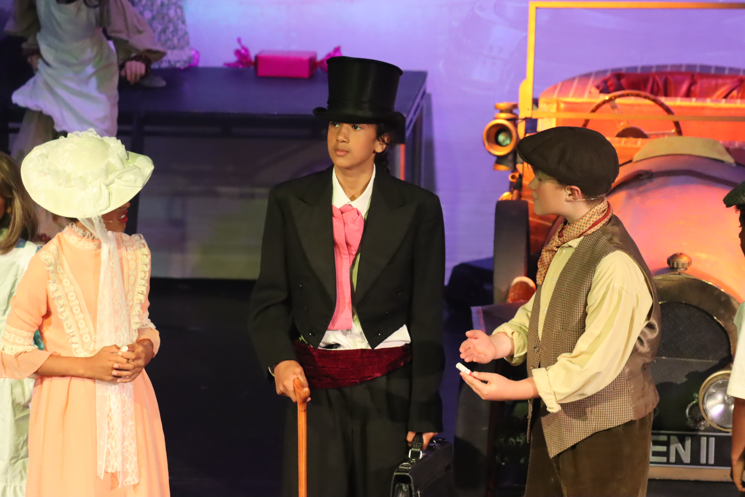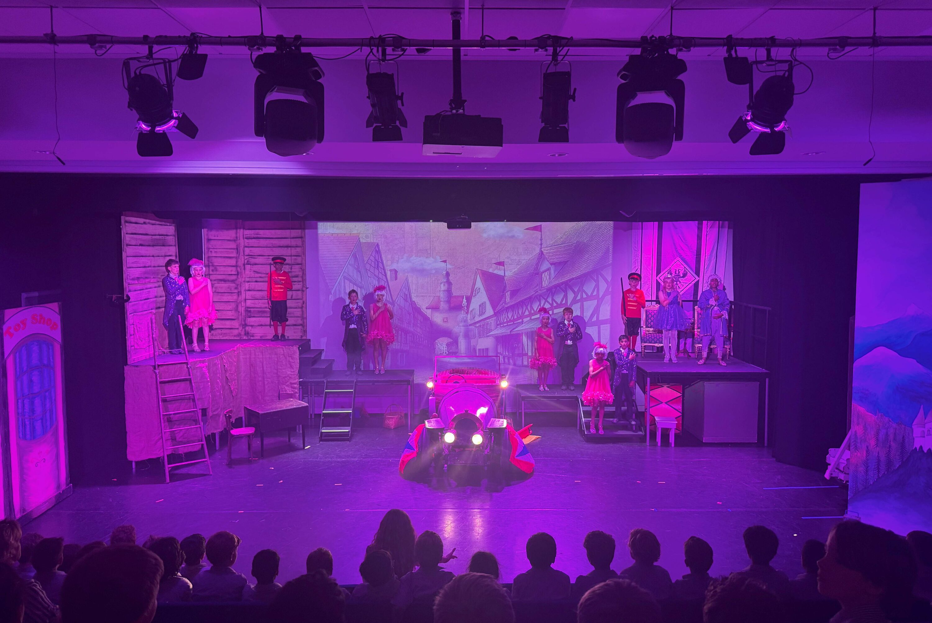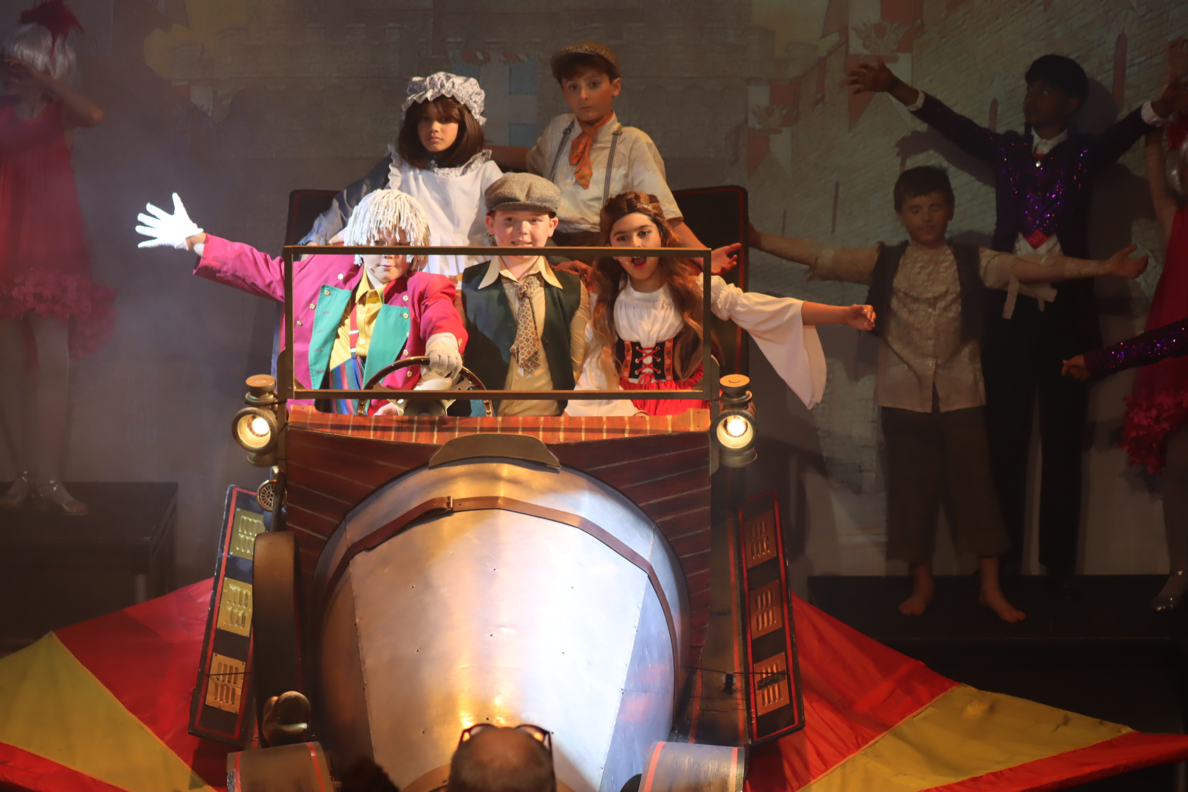 As the rehearsal week kicked off, energy levels soared with the arrival of Chitty herself – the magical, magnificent car that stole the show. It soon became a whirlwind of activity: tech run-throughs, fine-tuning special effects, and making sure every set transition and spotlight was perfectly timed. The set transformed daily, buzzing with crew, costume fittings, and last-minute prop polishing. It was a logistical feat, but the atmosphere crackled with anticipation – and we will never forget the gasps of delight when Chitty first flew on the stage”.